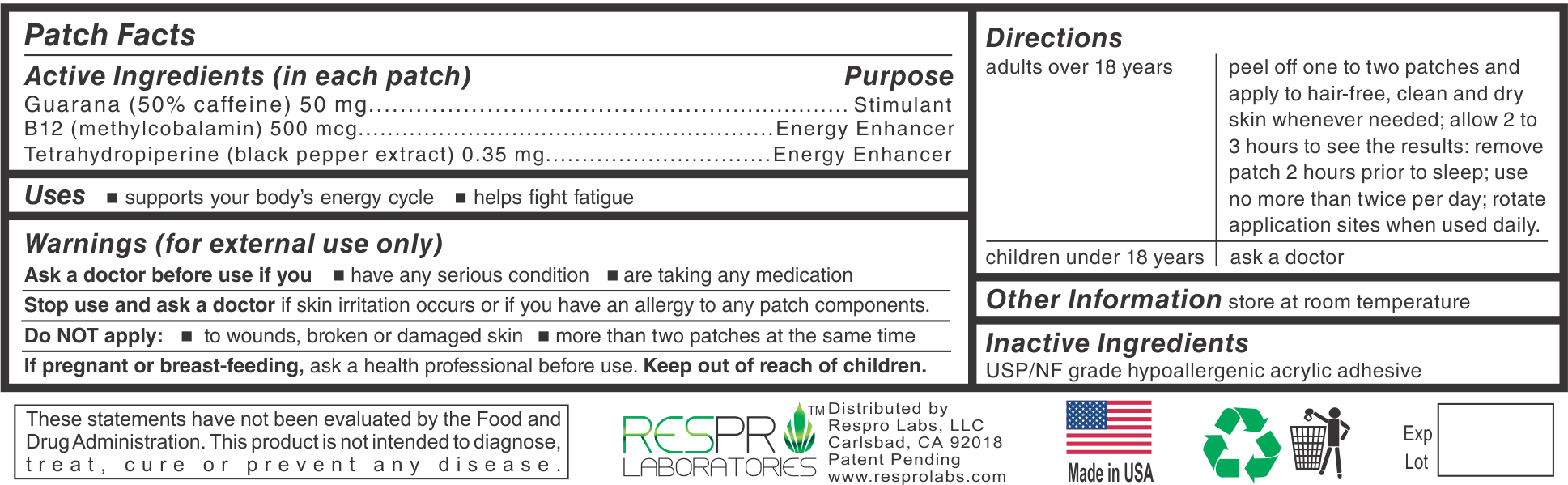 NEW FORMULA!! Respro Labs Energy Patch with Natural Guarana (paullinia cupana) is a revolutionary all-day patch that provides you with the fatigue-buffering jump start you need at any time of the day. Once the patch is applied, you will notice very constant and stable levels of energy throughout the day. The Energy patch is made with an advanced anti-fatigue formula to give you that additional oomph you're looking for. Experience an advanced Energy Patch formula designed to provide sustained energy support all day long without the crash normally experienced with other energy products. Each patch packs enough power to back you up throughout your day by providing you with continuous and sustained release of energy. Developed by Pharmacists and PhD Scientists for lab-proven superior release compared to competitor's energy products. Superior Energy blend scientifically crafted using Guarana (naturally contains 50% caffeine) for maximum sustained natural energy. Respro Labs Energy Patch with Natural Guarana is the smartest and most cost-effective choice for energy. No caffeine crash as seen with energy drinks. No sugar crash. No feeling of uncomfortable jitteriness. Safe, convenient, and easy to use on the go. The packaging was designed with your lifestyle in mind and for extreme portability.