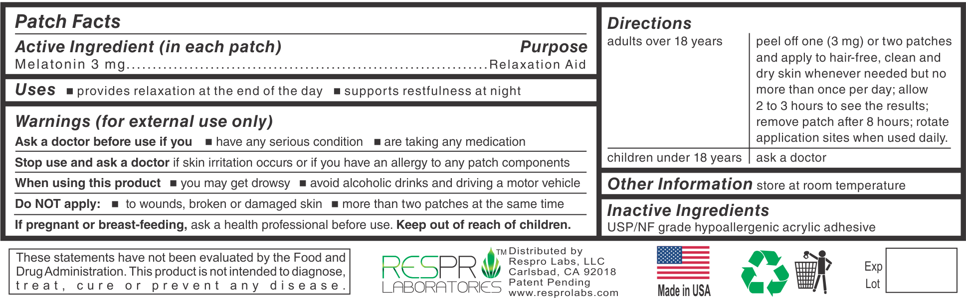 - Respro Labs patches are made with an advanced natural melatonin formula using effective, natural ingredients specially formulated for superior performance.